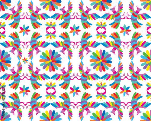 Otomí Style Pattern.Colorful Mexican Traditional Textile Embroidery Style. Seamless pattern with birds and flowers on white background
