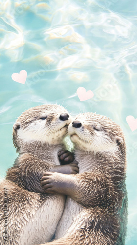 Otter couple swimming with hearts above, symbolizing love and bonding, St Valentines Day postcard
