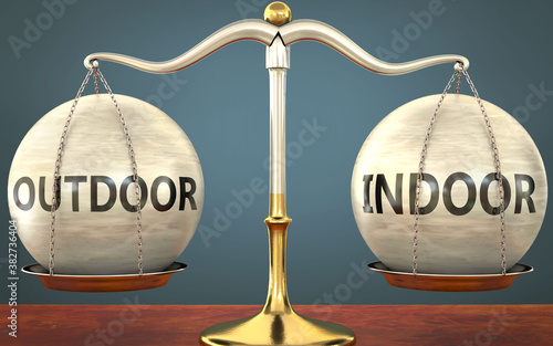 outdoor and indoor staying in balance - pictured as a metal scale with weights and labels outdoor and indoor to symbolize balance and symmetry of those concepts, 3d illustration