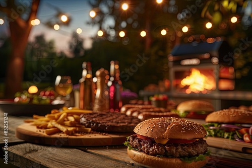 Outdoor barbecue with grilled burgers, steaks, and fries on a wooden table, illuminated by string lights and a warm fire in the background.