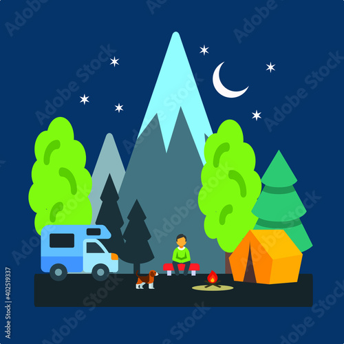outdoor camp flat concept icon design with mountains moon stars trees caravan person sitting in front of camp fire and tent and dog standing