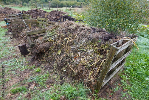 Outdoor compost bin decomposing organic garden waste