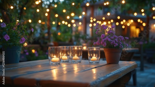 Outdoor dining setting with wooden tables and chairs,