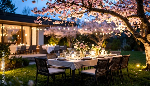 Outdoor dinner party under a blossoming cherry tree at twilight