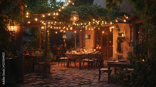 Outdoor Evening Dining Under String Lights on a Cozy Patio