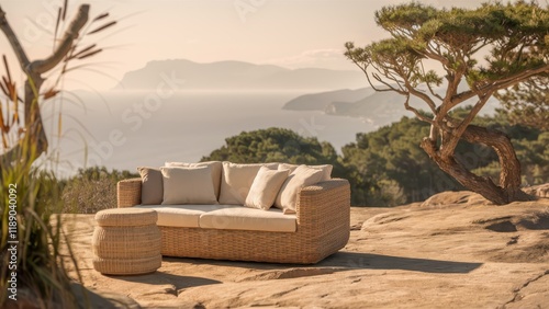 Outdoor luxury sofa, Mediterranean coastal view, rocky terrain, pine tree, warm sunset light, textured canvas, serene atmosphere, earth tones, minimalist design, natural materials, rustic elegance, pa