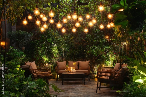 outdoor restaurant patio under a canopy of twinkling hanging lights, creating a magical setting for dining alfresco with friends and family