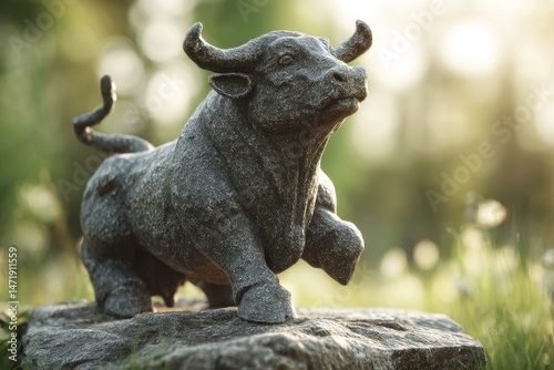 Outdoor stone bull sculpture in natural light.