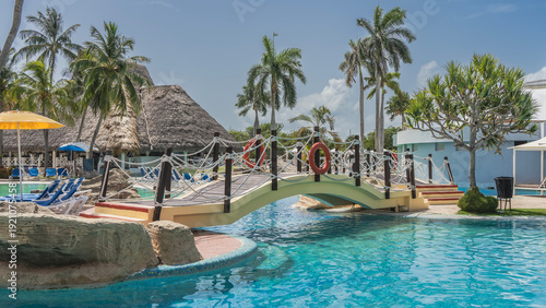 Outdoor swimming pool. Arched pedestrian bridge over aquamarine water.A lifebuoy on a rope railing. A building with a thatched roof. Palm trees against the blue sky, clouds. Cuba. Varadero. Resort.