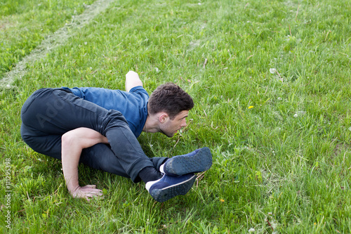 Outdoor yoga workout. Young man doing an exercise in the city park