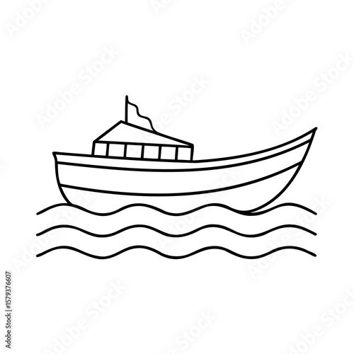 Outline a boat with a flag sailing on wavy water against a vessel ship
