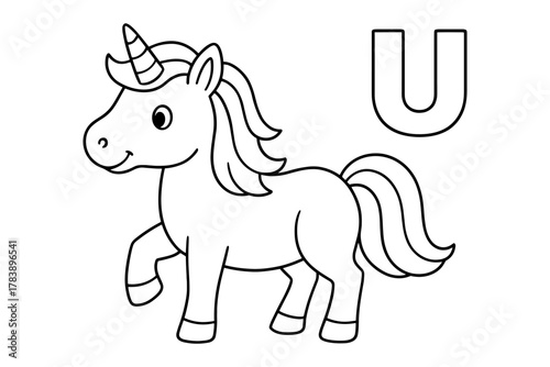 Outline cartoon unicorn with letter u for kids' alphabet learning