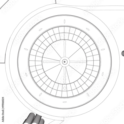Outline Casino roulette wheel with casino chips on table. View from above. Vector illustration.