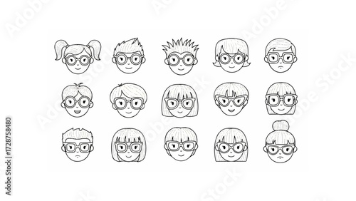 Outline drawings of various young people wearing thick-rimmed glasses suitable for educational.