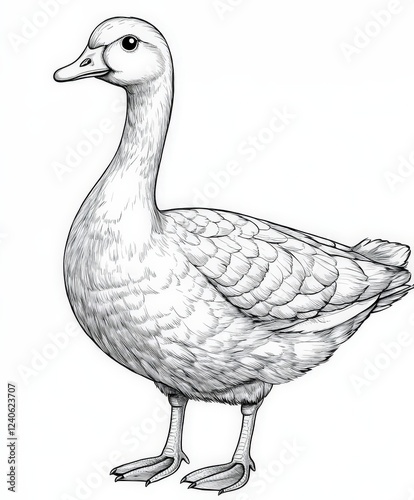 Outline Illustration of a Standing Domestic Duck with Detailed Feathers