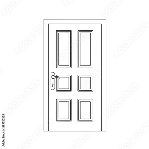 Outline of a closed door with handle and lock, featuring four inset panels