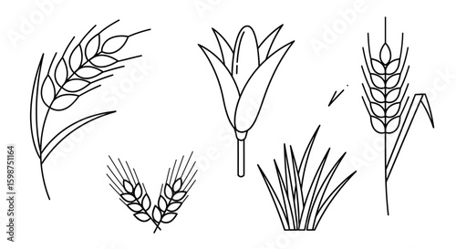 Outlined drawing showcasing several wheat stalks, blades of grass, and a flower blossom design element