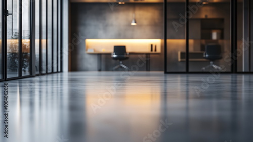 Out-of-focus image of a minimalist office with sleek furniture and glass partitions