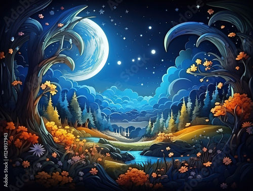 Outstanding Illustration of a fantasy landscape with a river, trees and sun