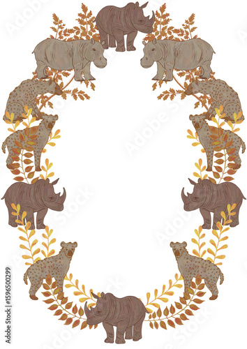 Oval round folk frame for design. Yellow autumn leaves and animals. Rhinoceros, hyenas, hippos illustration