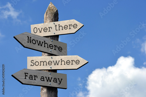 Over there, somewhere, nowhere, far away - wooden signpost with four arrows, sky with clouds