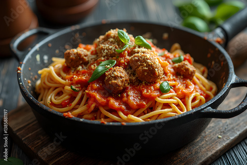 Overhead Italian Skillet Pasta with Basil and Cherry Tomatoes – Generative AI