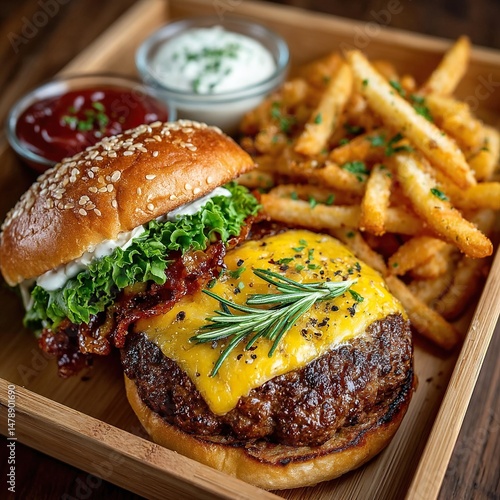 Overhead shot of a gourmet burger with fries and dipping sauce, highlighting the meal's composition.