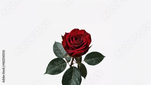 Overhead shot of a rosebud accompanied by leaves on a white background