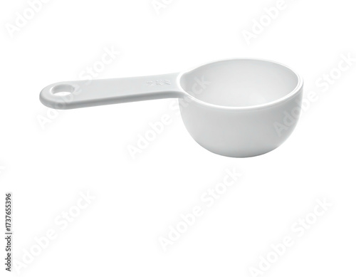 Overhead shot of a white measuring scoop, handle extended left, with a shadow