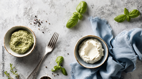 Overhead shot of bowls of pesto and ricotta, basil leaves, peppercorns, salt, and a fork on a textured gray surface, suggesting a culinary or food blog concept