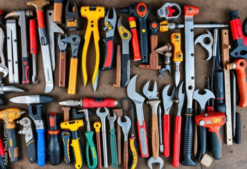 Overhead shot of various construction tools neatly arranged in a workshop, carpentry, site