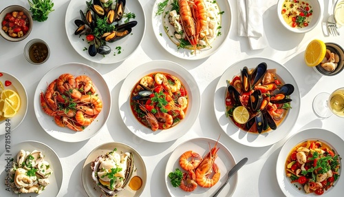 Overhead View of a Generous Seafood Feast Arranged on a White Table with Various Shellfish and Shrimp Dishes Garnished with Herbs and Lemon Slices in Bright Sunlight