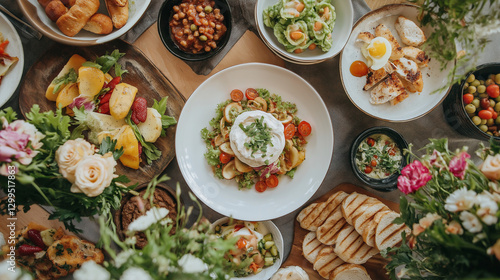 Overhead view of a table laden with a delicious array of food and fresh flowers.