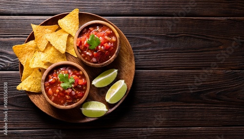 overhead view of two small wooden bowls of salsa with tortilla chips and limes on a dark wooden surface