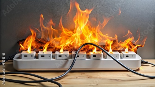 Overloaded power strip is catching fire on a desk, creating a serious fire hazard