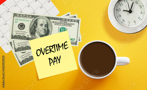 Overtime pay is shown using the text as business and financial concept
