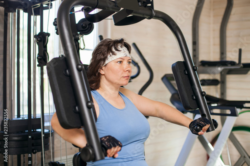 Overweight woman working out on training apparatus. Home exercise machine. Selective focus.