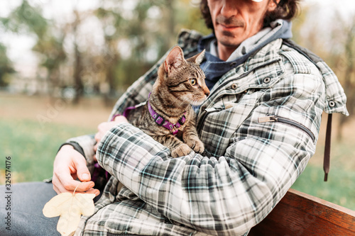Owner holding cute, striped cat inside his jacket, outdoors photo