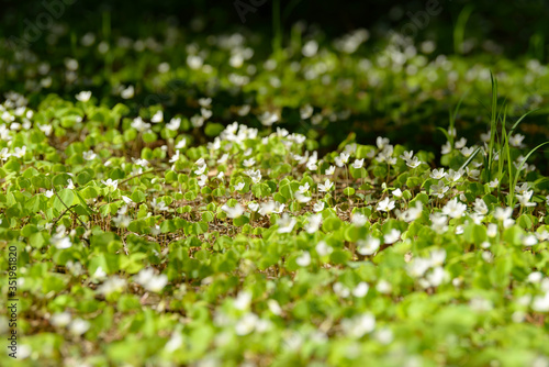 Oxalis articulata or acetosella. Medicinal wild blossoming wood sorrel herb. Grass with white, pink or yellow flowers growing in the forest or glade. Healthy plant used as food and drink ingredient.