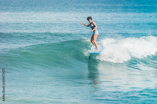 Pacific islander melanesian papuan surfer girl with afro surfing on blue longboard in crystal clear water at Padang Padang beach, Bali, Indonesia
