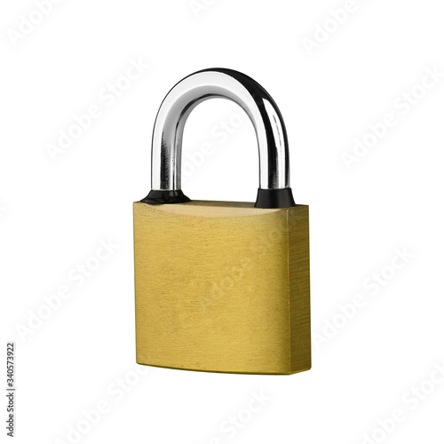 PADLOCK. Yellow metallic padlock on white background. Clipping Path. .