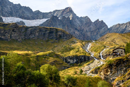 paesaggio alpino 01 - cime innevate con cascata e abitazione.