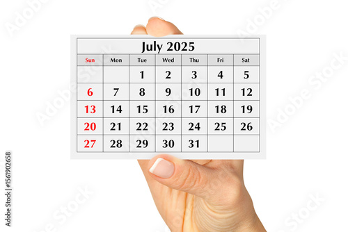 Page of the annual monthly calendar july 2025 in hand. Isolated on transparent png