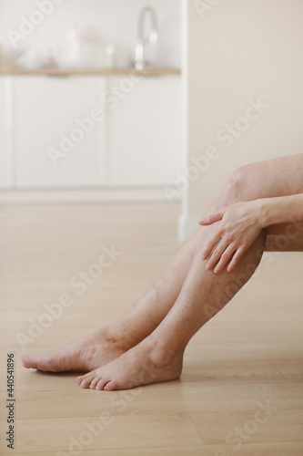 Painful varicose and spider veins on active womans legs, self-helping herself in overcoming the pain. Vascular disease, varicose veins problems, active life concept.