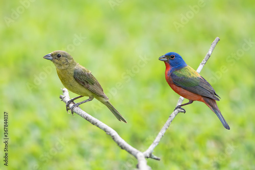 Painted Bunting Pair Perched on Bare Branch Against Spring Green Background