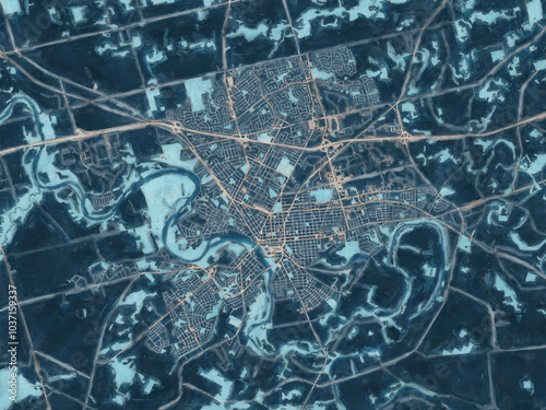 Painterly Style City Map of Brantford Ontario, Canada in a Blue Color Scheme.