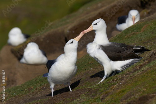 Pair of Black-browed Albatross (Thalassarche melanophrys) courting on the coast of Saunders Island in the Falkland Islands.