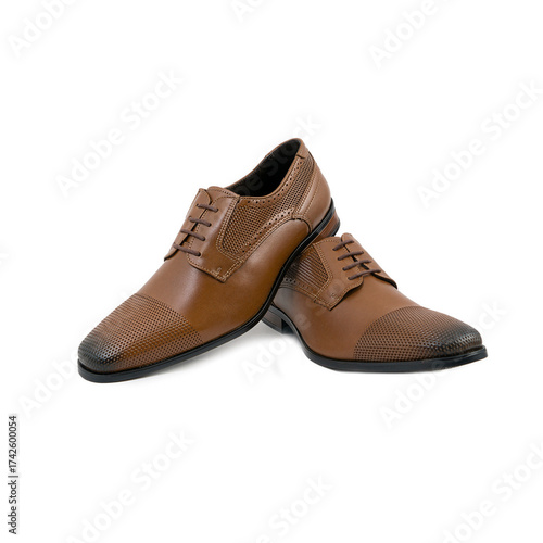 Pair of brown perforated leather dress shoes crossing gracefully, creating a refined polished formal mood.