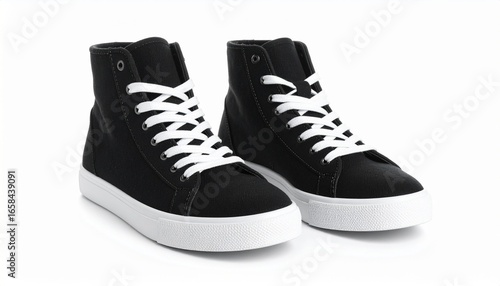 "Pair of high-top sneakers in black canvas with white laces, isolated on white background, streetwear footwear"