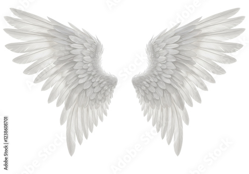 Pair of large white feathered angel wings, isolated on white background